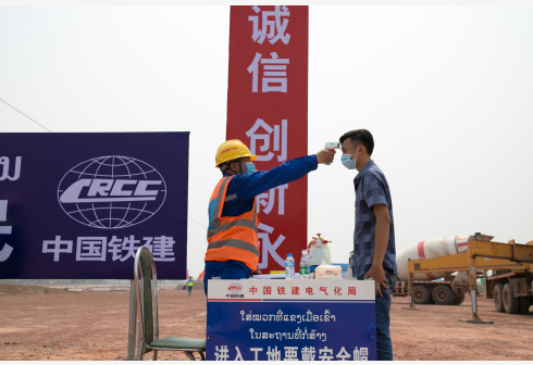 3月31日,中国铁建电气化局员工为进入中老铁路万象站40米四管通信铁塔浇筑现场的人员测体温。中老铁路万象站40米四管通信铁塔31日上午顺利浇筑,标志着中老铁路全线通信信号工程正式拉开序幕。 新华社 发(凯乔摄)