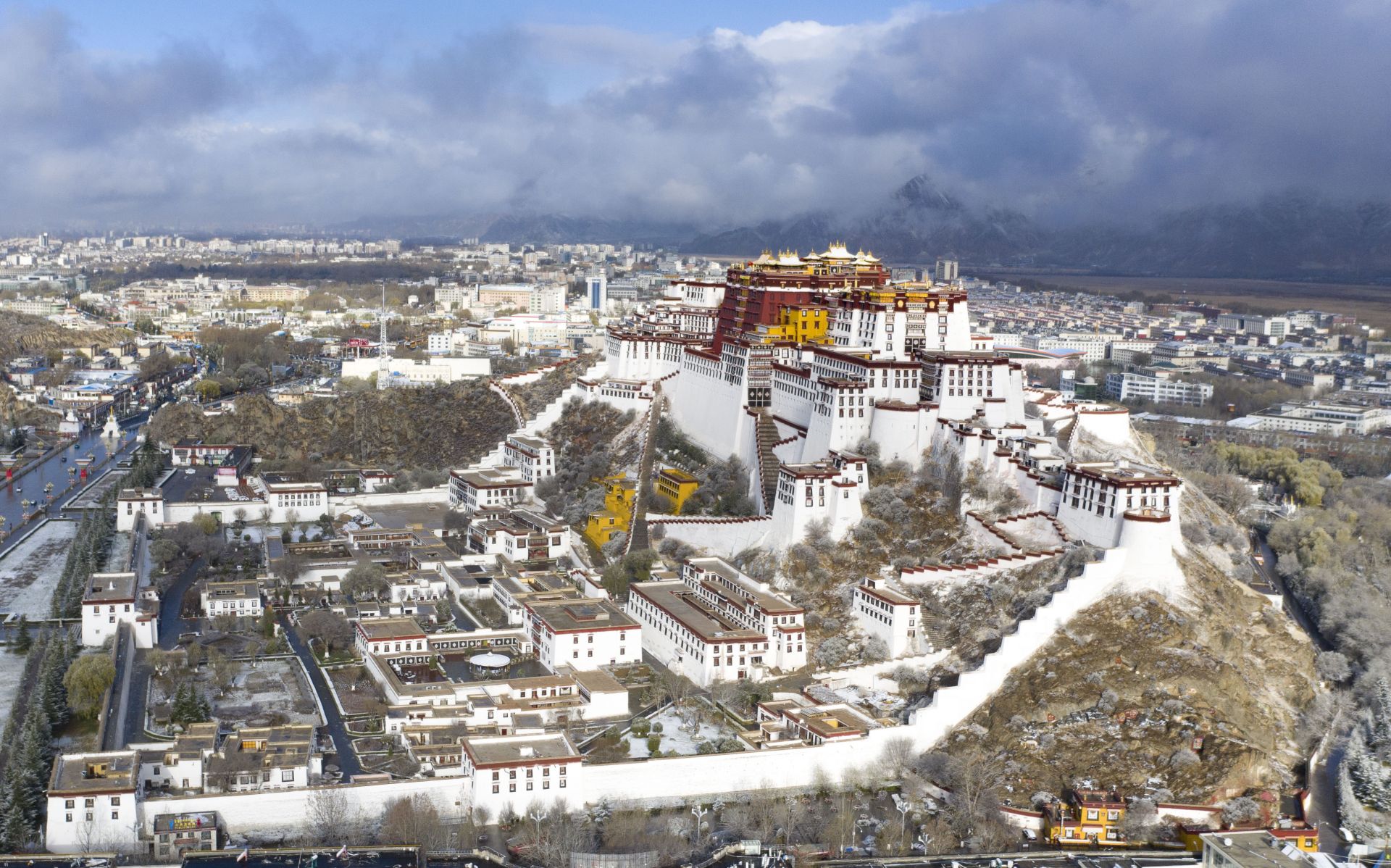 4月5日拍摄的布达拉宫雪景(无人机照片)。 当日,西藏拉萨迎来降雪,高原古城银装素裹,美如画卷。 新华社记者 普布扎西 摄
