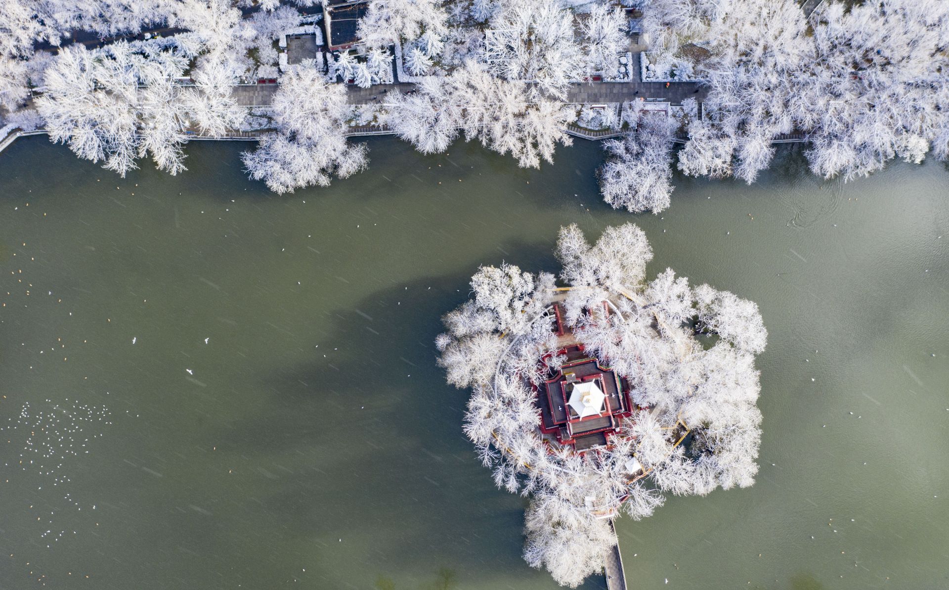 4月5日拍摄的拉萨宗角禄康公园雪景(无人机照片)。新华社记者 普布扎西 摄
