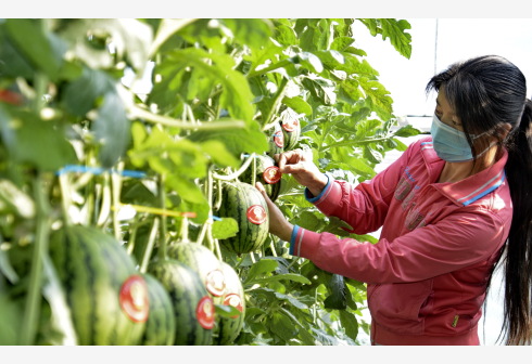 4月24日,庞各庄老宋瓜果专业合作社员工为即将采摘的西瓜贴标签。近期,北京大兴区庞各庄镇老宋瓜果专业合作社的春季西瓜开始大批上市销售。疫情发生以来,庞各庄镇老宋瓜果专业合作社一度遇到用工、运输、防疫等困难,庞各庄镇党委和政府积极为合作社协调农业用工、肥料调运、调配防疫物资,让合作社顺利开始农业生产。该合作社采取了“企业+合作社+基地+农户”的模式,472户当地农民加入合作社,2007年至今合作社销售西瓜20.62万余吨,带动农民增收1.65亿元。 新华社记者 李欣 摄