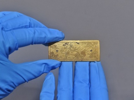 这是发掘出水的麒麟纹金牌饰(4月15日摄)。 4月29日,记者在四川眉山市彭山区举行的新闻发布会上获悉,2019至2020年度江口沉银遗址考古发掘共出土以金银器为主的文物10000余件,其中一枚“蜀世子宝”是国内首次发现世子金宝实物。 新华社记者刘坤摄
