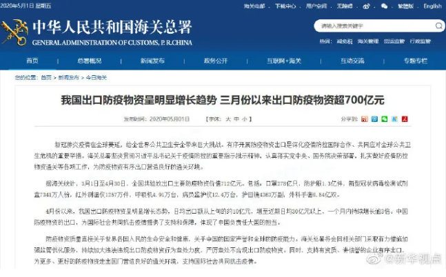 ◎ 海关总署发布的数据显示,4月份以来我国防疫物资出口增长明显,日均出口额一个月内持续增长逾3倍。