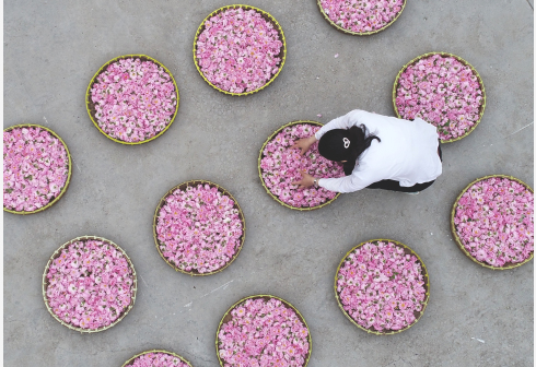 5月10日,在江苏省海安市城东镇石庄村,农民在检查刚采摘的玫瑰花(无人机照片)。 新华社发(向中林 摄)