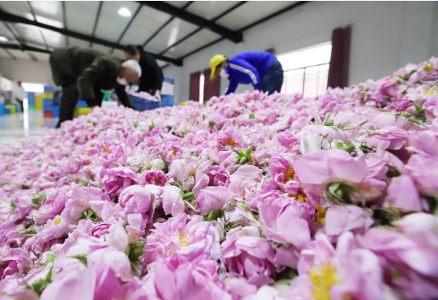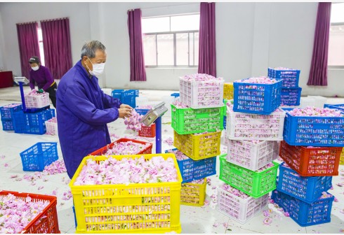 5月10日,在江苏省海安市城东镇石庄村玫瑰种植园内,农民对玫瑰花进行称重装箱。 近日,江苏省海安市城东镇石庄村玫瑰种植园内的玫瑰花竞相绽放,农民忙着采摘、装运鲜花,发送到各地的工厂进行精油提炼等深加工。同时,玫瑰园的美丽景致吸引了周边地区的人们前来观光旅游、体验采摘。玫瑰花成为当地农民脱贫致富、乡村振兴的“致富花”。 新华社发(向中林 摄)