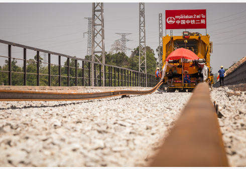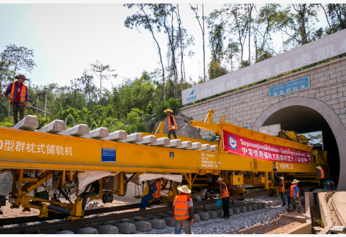 5月23日,在老挝万象省庚凯村隧道附近的中老铁路施工现场,中老两国工人协力铺轨。 随着每排14根轨枕按照规定距离平稳铺过庚凯村隧道,500米长钢轨随着牵引机稳准落定,中老铁路铺轨23日通过第一座隧道,从老挝首都万象一路向北。 新华社发(凯乔摄)