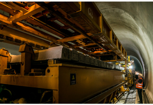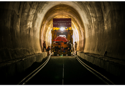 5月23日,在老挝万象省庚凯村隧道的中老铁路施工现场,中老两国工人协力铺轨。 新华社发(凯乔摄)