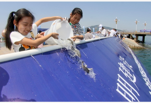 6月6日,小朋友在山东省烟台市举办的“全国放鱼日”增殖放流活动中投放鱼苗。当日是“全国放鱼日”,多地举办增殖放流活动。 新华社 发(唐克 摄)
