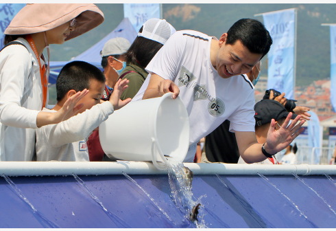 6月6日,市民在山东省烟台市举办的“全国放鱼日”增殖放流活动中投放鱼苗。当日是“全国放鱼日”,多地举办增殖放流活动。新华社 发(唐克 摄)
