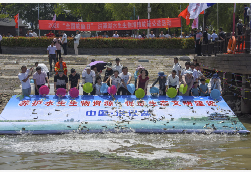 6月6日,在江苏省淮安市洪泽区洪泽湖渔人湾古堰码头,人们在“全国放鱼日”增殖放流活动中投放鱼苗。当日是“全国放鱼日”,多地举办增殖放流活动。新华社 发(张建 摄)