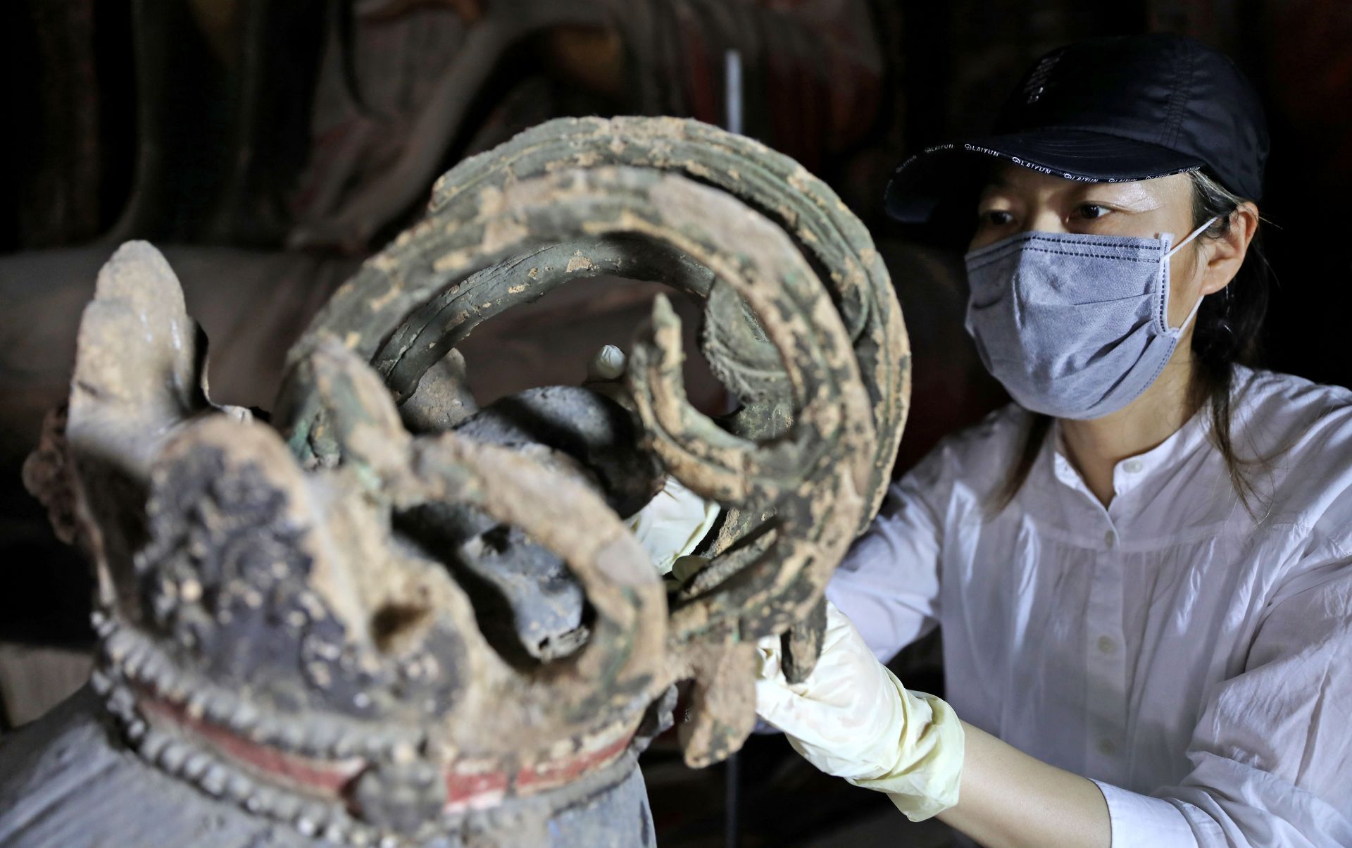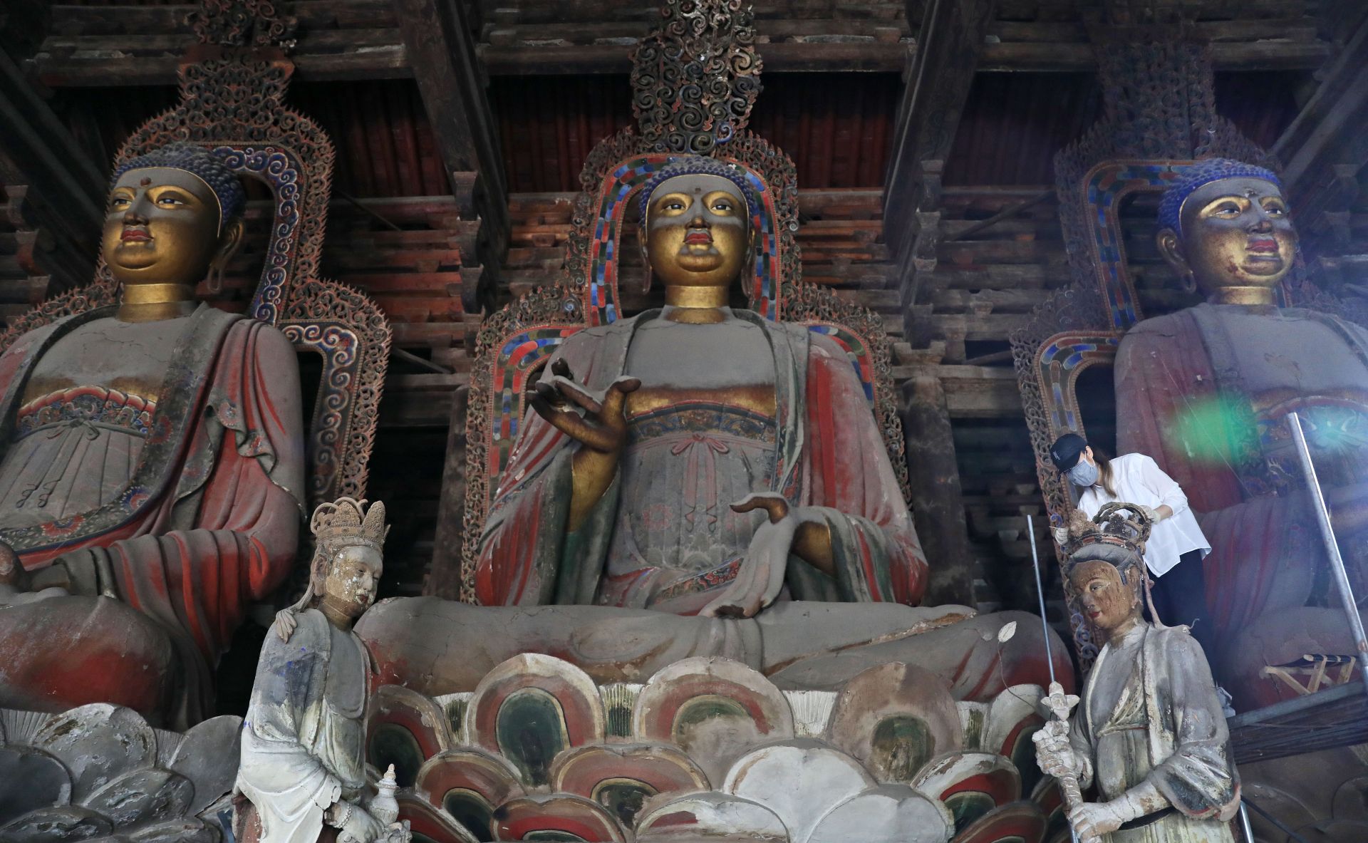 6月8日,工作人员对奉国寺的彩绘泥塑进行保护修复。新华社记者 姚剑锋 摄