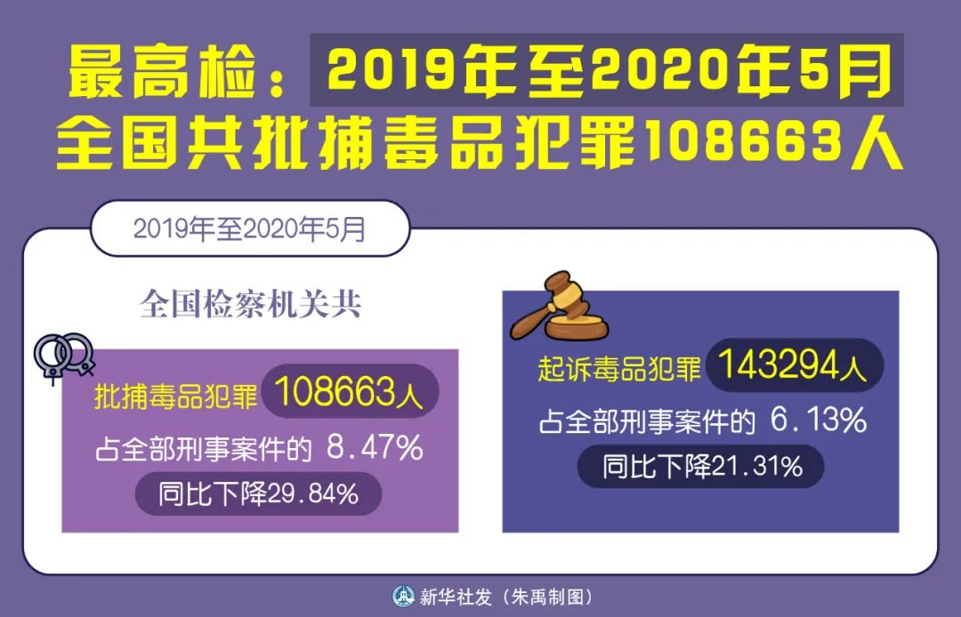 ◎ 最高检消息,2019年至2020年5月,全国检察机关共批捕毒品犯罪108663人,占全部刑事案件的8.47%,同比下降29.84%。