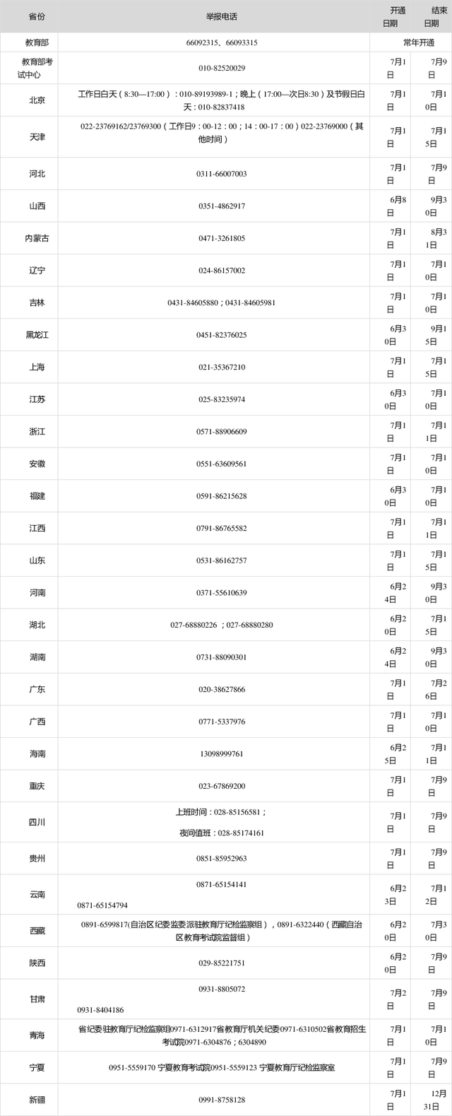 教育部公布2020年高考举报电话