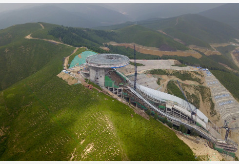 这是位于张家口赛区的国家跳台滑雪中心(7月30日无人机拍摄)。在申冬奥成功五周年之际,记者来到北京、延庆和张家口三个赛区,探访处于建设改造冲刺阶段的冬奥场馆和设施,近距离了解2022北京冬奥会筹备情况。新华社记者 张晨霖 摄