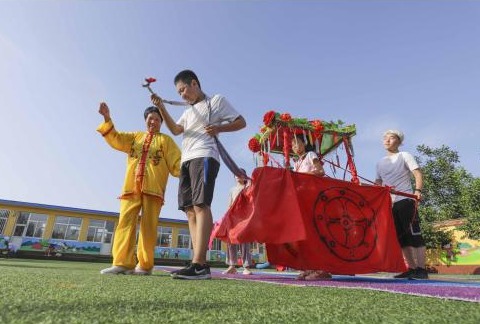 8月4日,孩子们在河北省遵化市平安城镇大麻各庄村校园操场练习民俗节目。 新华社发(刘满仓 摄)