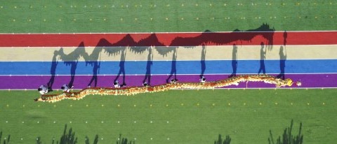 8月4日,孩子们在河北省遵化市平安城镇大麻各庄村校园操场练习民俗节目(无人机照片)。 新华社发(刘满仓 摄)