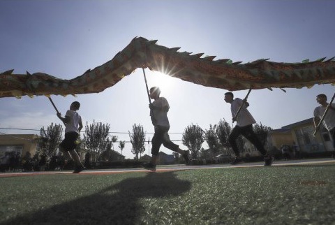 8月4日,民间艺人在河北省遵化市平安城镇大麻各庄村校园操场指导孩子们学习民俗节目。 暑假期间,河北唐山遵化市平安城镇大麻各庄村的孩子们在民间艺人的指导下学习舞龙、赶驴、跑旱船等民俗节目,丰富暑期生活。 新华社发(刘满仓 摄)