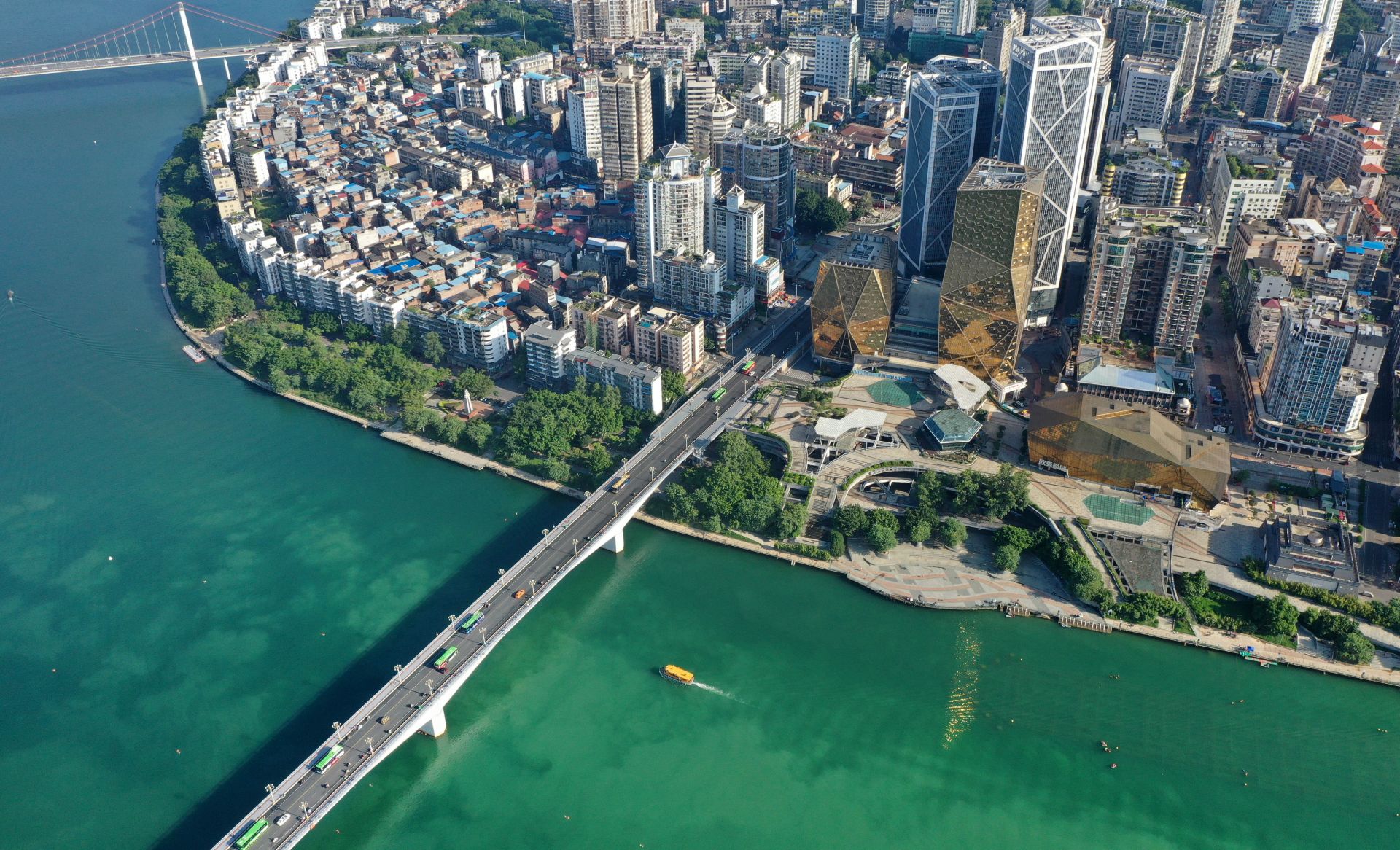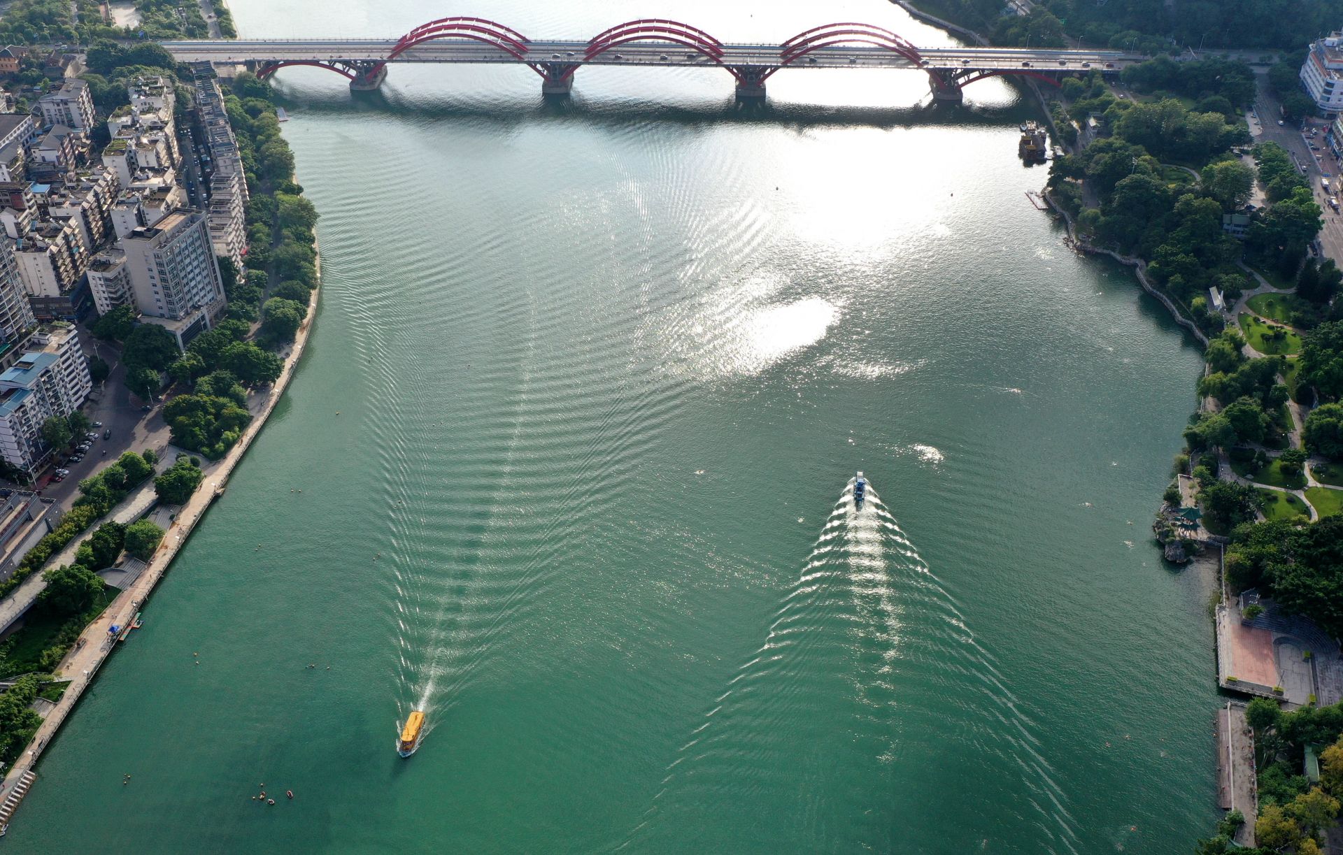 8月16日,在广西柳州,水上公交船在柳江上行进(无人机照片)。 近日,广西柳州天气晴好,柳江清澈碧绿,成为市区一道靓丽的风景。 新华社发(黎寒池 摄)