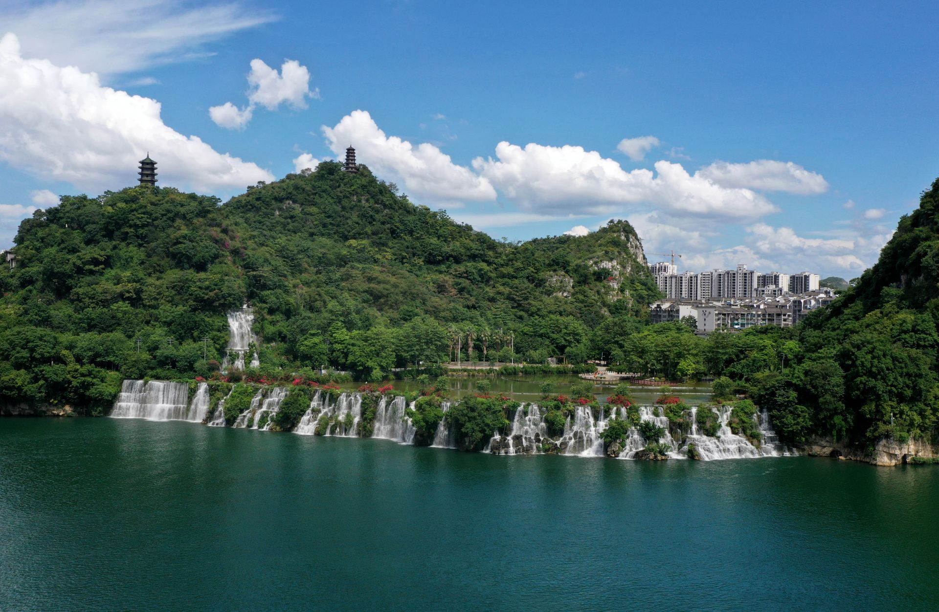 8月16日拍摄的广西柳州市柳江边的人工瀑布群(无人机照片)。新华社发(黎寒池 摄)