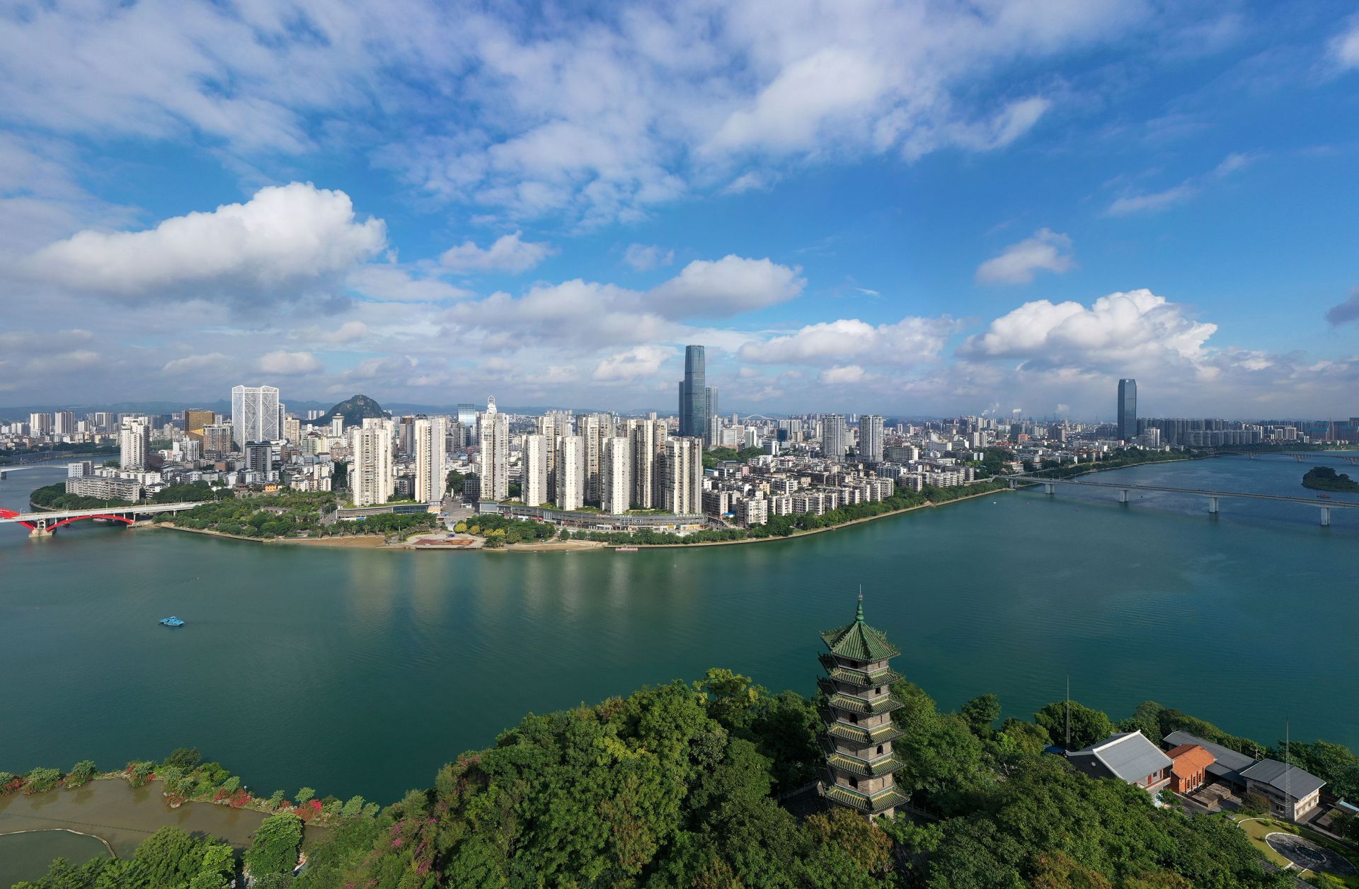 8月15日拍摄的广西柳州市柳江水域(无人机照片)。新华社发(黎寒池 摄)