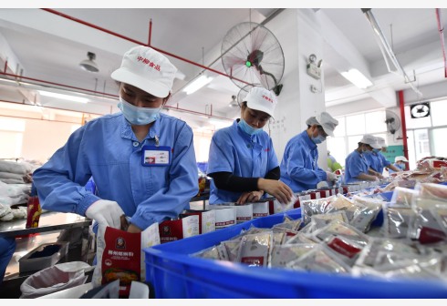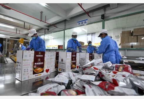 8月30日,在柳州市螺蛳粉产业园广西中柳食品科技有限公司生产车间,工人在生产线上包装螺蛳粉。今年以来,广西柳州市螺蛳粉出口量大幅增长。据统计,1至7月,柳州市出口螺蛳粉52批约1535万元人民币。新华社记者 黄孝邦 摄