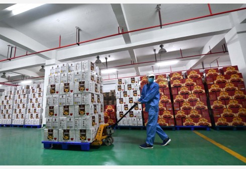 8月30日,在柳州市螺蛳粉产业园广西中柳食品科技有限公司生产车间,工人将包装好的螺蛳粉搬进仓库。今年以来,广西柳州市螺蛳粉出口量大幅增长。据统计,1至7月,柳州市出口螺蛳粉52批约1535万元人民币。新华社记者 黄孝邦 摄