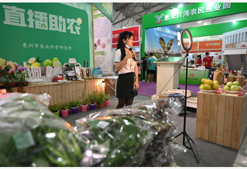 9月7日,福建省泉州市农业科学研究所的工作人员在展会进行助农直播推销农产品。当日,第十三届海峡两岸(泉州)农产品采购订货会在福建泉州南安市举行。展会上随处可见的助农直播成为本届展会的新亮点。 新华社记者 宋为伟 摄