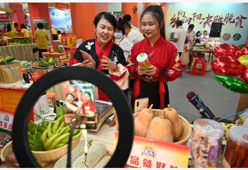 9月7日,由福建省南安市向阳乡乡镇干部等组成的“七仙女”助农团队成员吴凤茹(左)、林雅军在现场进行助农直播推销该乡农产品。当日,第十三届海峡两岸(泉州)农产品采购订货会在福建泉州南安市举行。展会上随处可见的助农直播成为本届展会的新亮点。新华社记者 宋为伟 摄