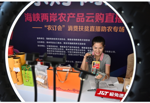 9月7日,网络主播在农订会直播区进行助农直播推销农产品。当日,第十三届海峡两岸(泉州)农产品采购订货会在福建泉州南安市举行。展会上随处可见的助农直播成为本届展会的新亮点。 新华社记者 宋为伟 摄
