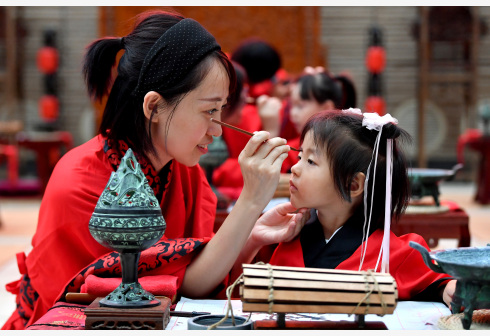 9月13日,家长在孩子额头上点朱砂,进行“朱砂开智”。当日,一场汉服“开笔礼”在西安大唐西市博物馆举行,多名孩童着汉服,行汉礼,通过“朱砂开智”“启蒙描红”等环节体验中国传统文化。新华社记者 刘潇 摄