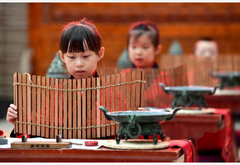 9月13日,小朋友在诵读经典。当日,一场汉服“开笔礼”在西安大唐西市博物馆举行,多名孩童着汉服,行汉礼,通过“朱砂开智”“启蒙描红”等环节体验中国传统文化。新华社记者 刘潇 摄