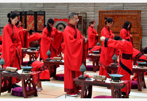 9月13日,小朋友向家长行礼。当日,一场汉服“开笔礼”在西安大唐西市博物馆举行,多名孩童着汉服,行汉礼,通过“朱砂开智”“启蒙描红”等环节体验中国传统文化。新华社记者 刘潇 摄
