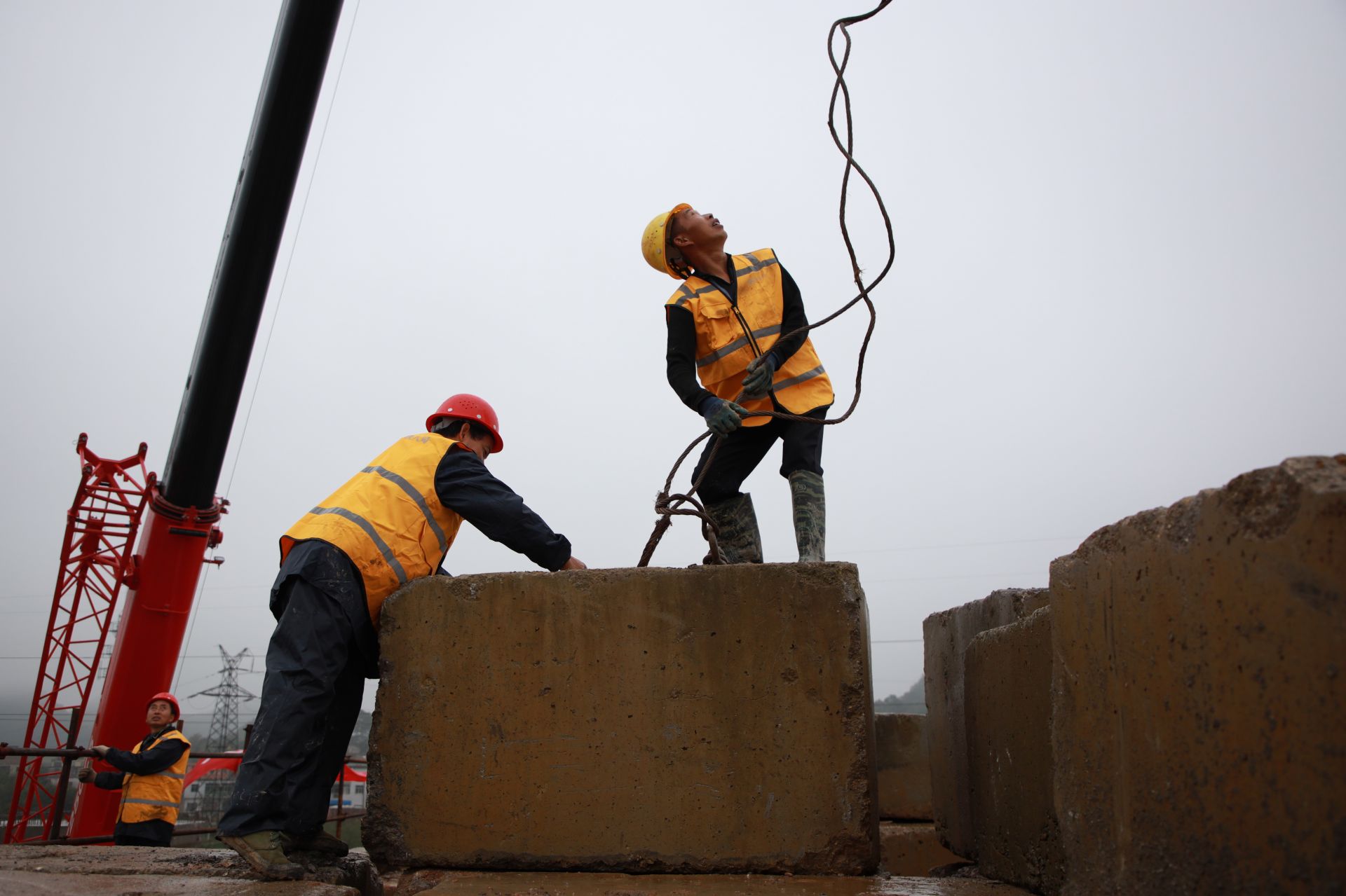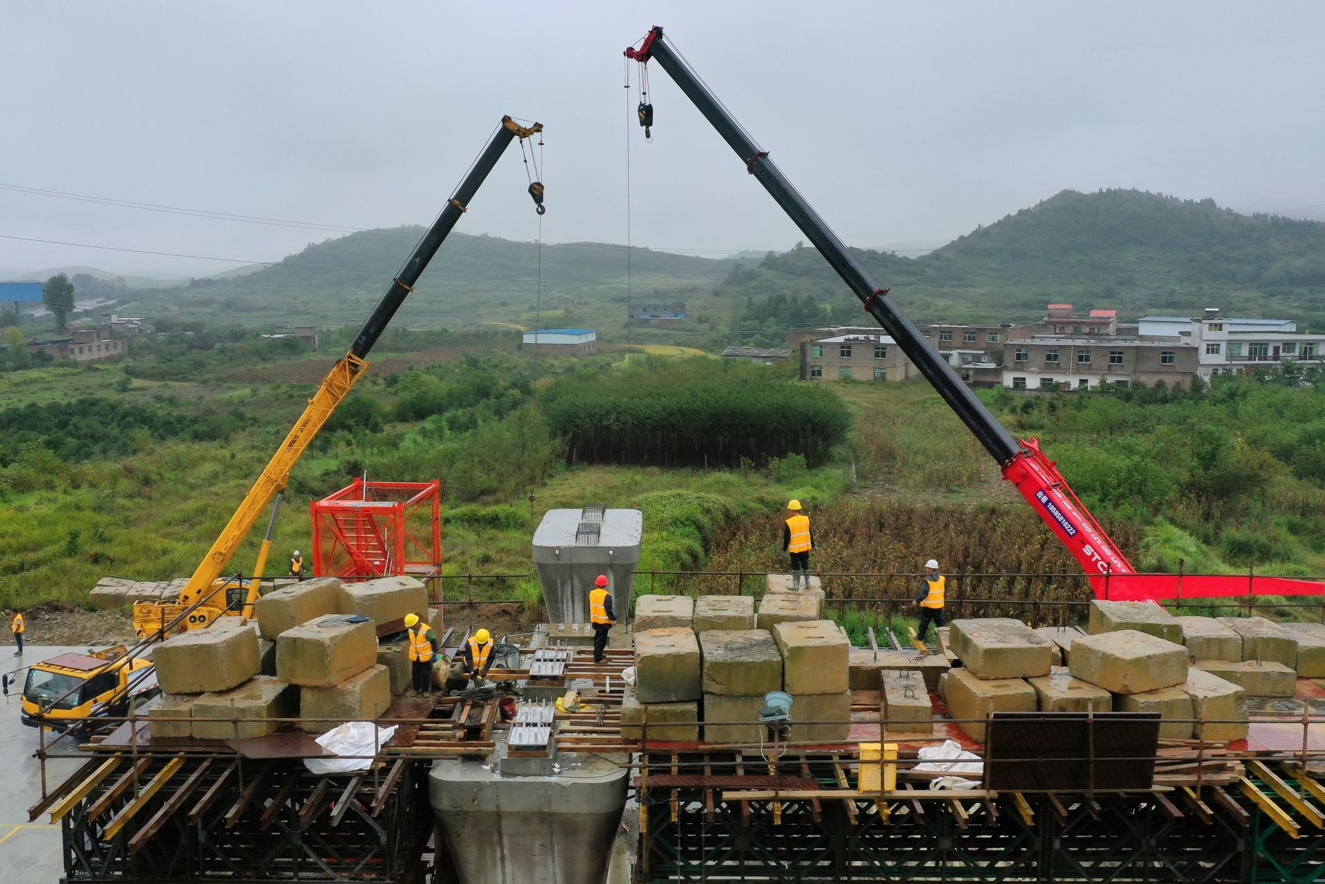 9月15日,中铁八局建设者在贵阳市域快铁西南环线月亮湖车站现场吊装石料(无人机照片)。新华社记者 刘续 摄