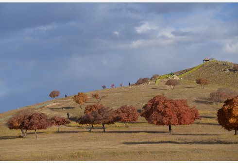 10月12日,游客在五角枫生态旅游景区游玩。金秋时节,内蒙古兴安盟科尔沁右翼中旗五角枫生态旅游景区的五角枫迎来最佳观赏期,棵棵枫树点缀了秋日草原,美景如画。新华社记者 叶紫嫣 摄