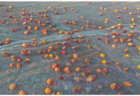 10月11日,观光车行驶在五角枫生态旅游景区内的道路上(无人机照片)。金秋时节,内蒙古兴安盟科尔沁右翼中旗五角枫生态旅游景区的五角枫迎来最佳观赏期,棵棵枫树点缀了秋日草原,美景如画。 新华社记者 徐钦 摄