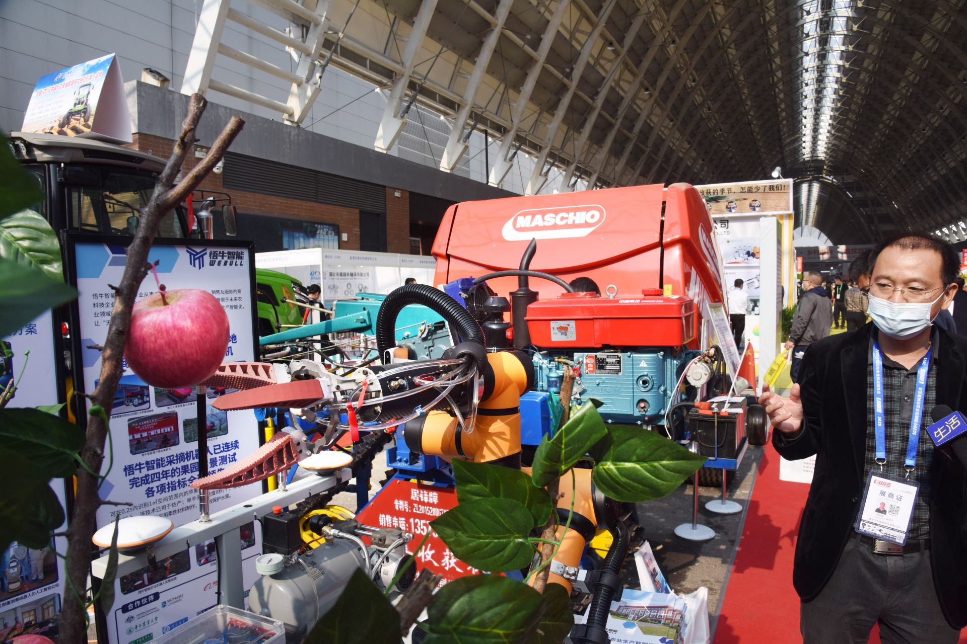 11月13日,参展商在农机展上介绍“苹果采摘机器人”。新华社记者 李紫恒 摄