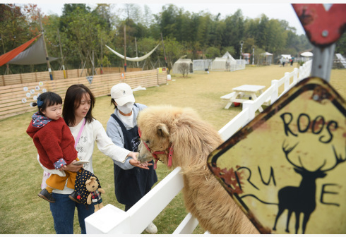 11月17日,家长带着孩子在菰城村一家动物农场喂骆驼。浙江湖州吴兴区道场乡菰城村是一个毗邻主城区的古村落,村里利用闲置荒地引进一个集露营、宠物主题游为一体的动物农场,吸引不少游客来这里享受与动物和自然相处的时光。5月试运营以来,动物农场将当地的生态资源向旅游资源转化,带动产业提档升级和融合发展。 新华社记者 翁忻旸 摄
