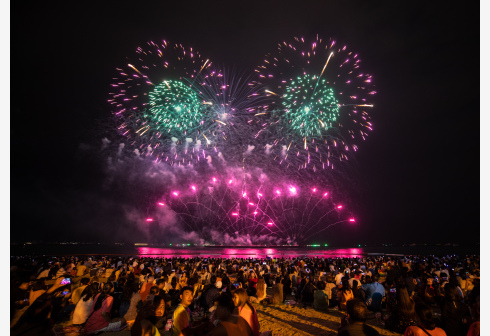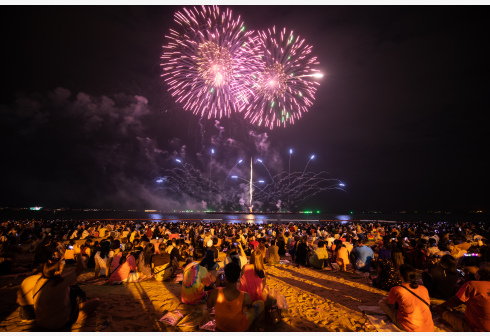 11月27日,游客在泰国芭堤雅的海滩上欣赏烟花表演。泰国芭堤雅于11月27日至28日举行烟花节,吸引众多游客前往观赏。新华社记者 张可任 摄