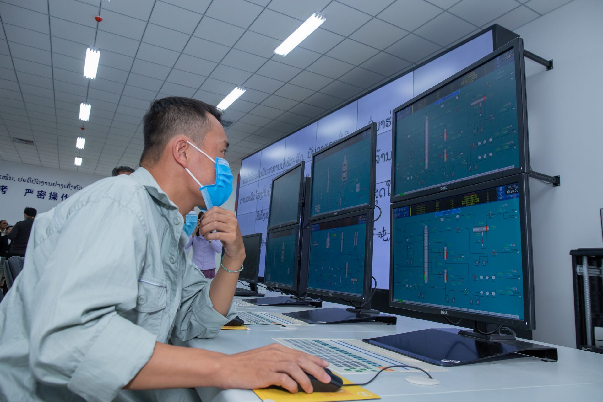 11月30日,在老挝首都万象,一名老挝石油化工股份有限公司员工在中控室工作。新华社发(凯乔摄)