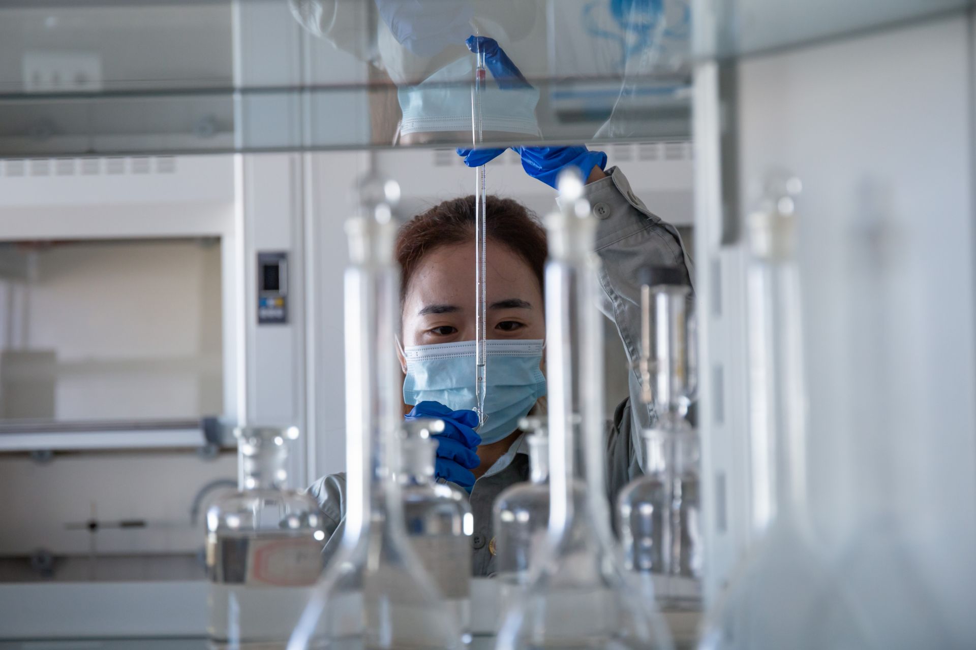 11月30日,在老挝首都万象,一名老挝石油化工股份有限公司员工在化验室检测样品。新华社发(凯乔摄)