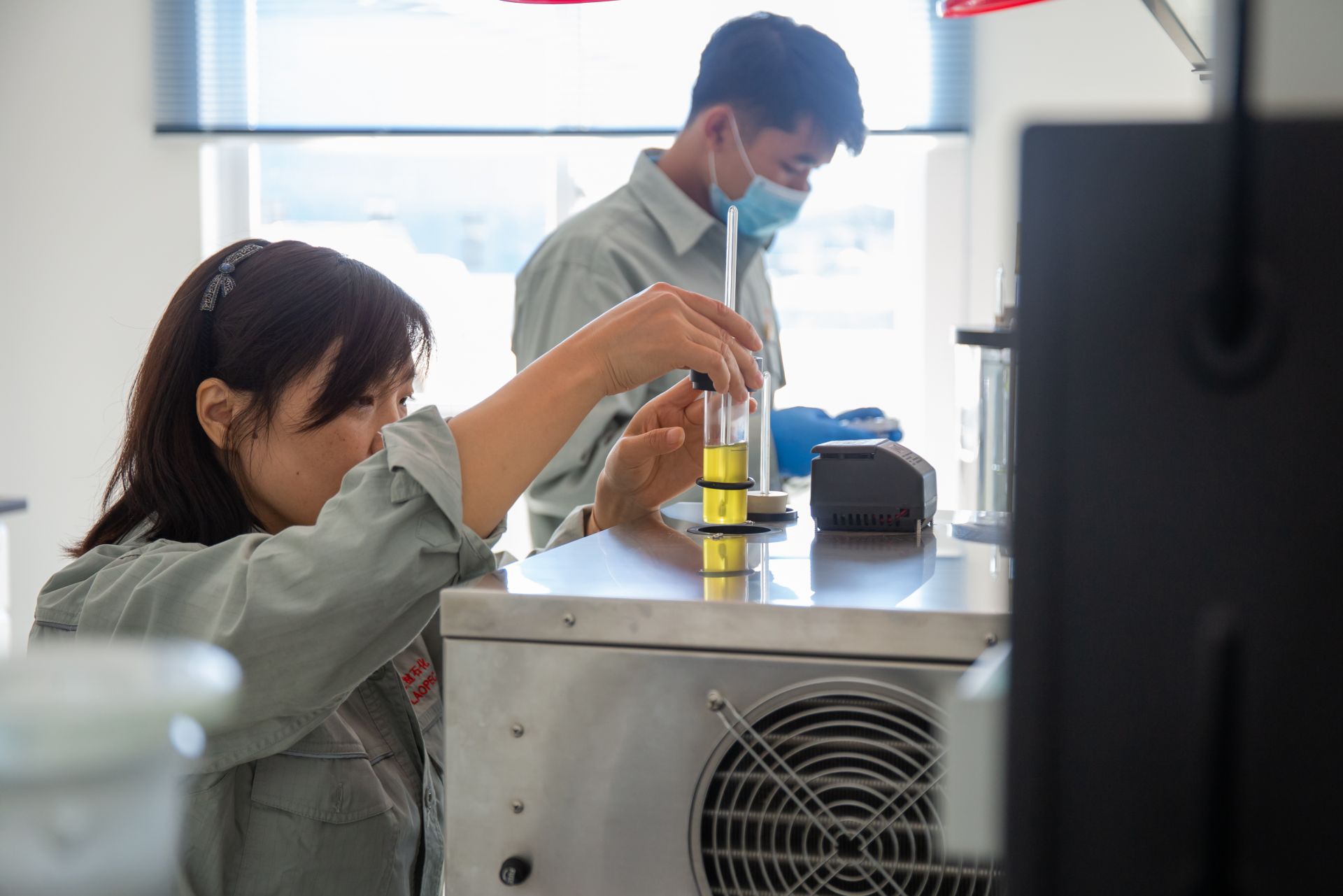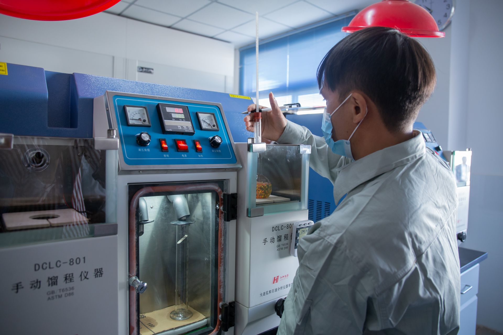 11月30日,在老挝首都万象,老挝石油化工股份有限公司员工在化验室检测样品。新华社发(凯乔摄)