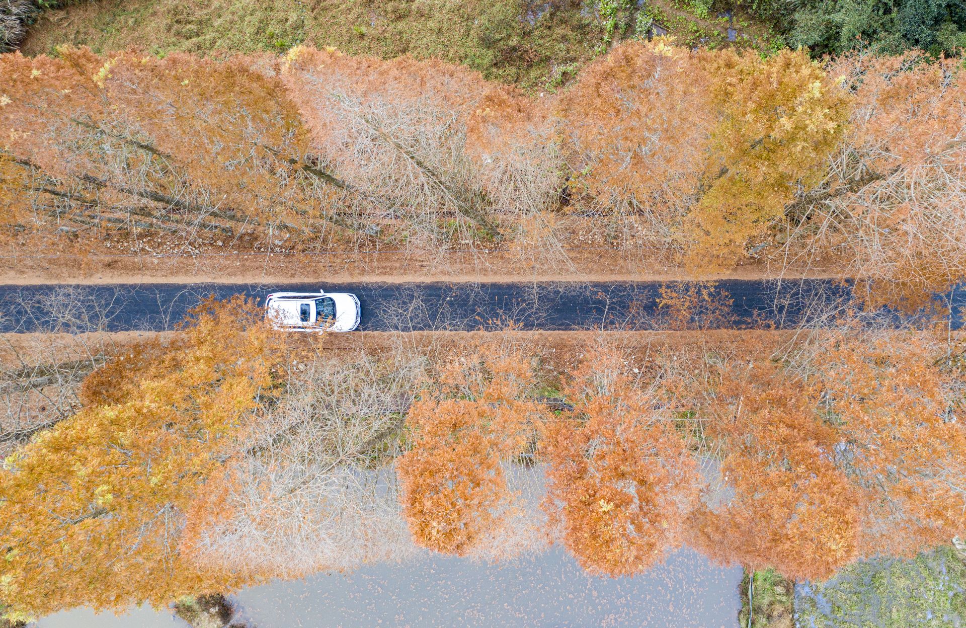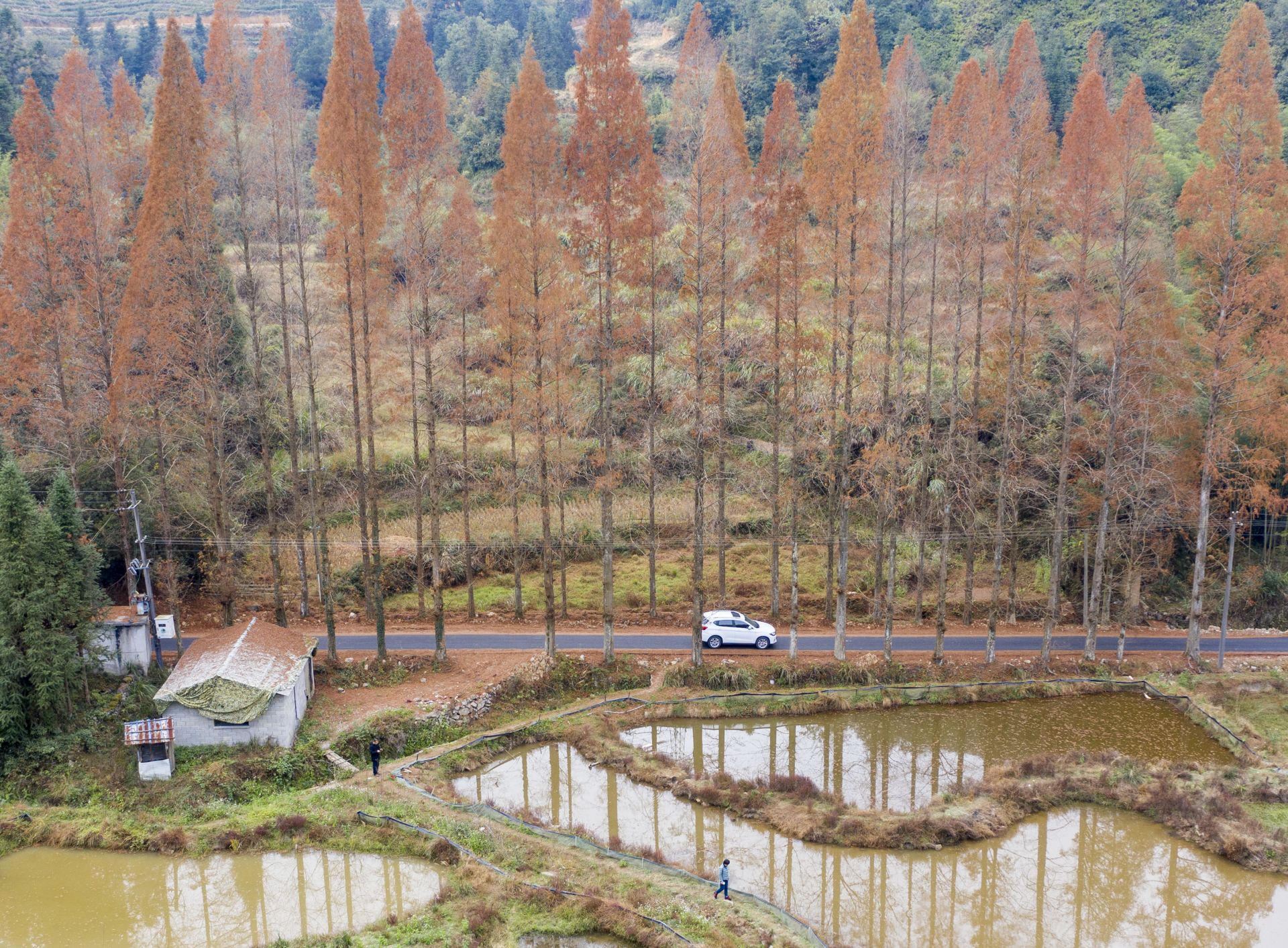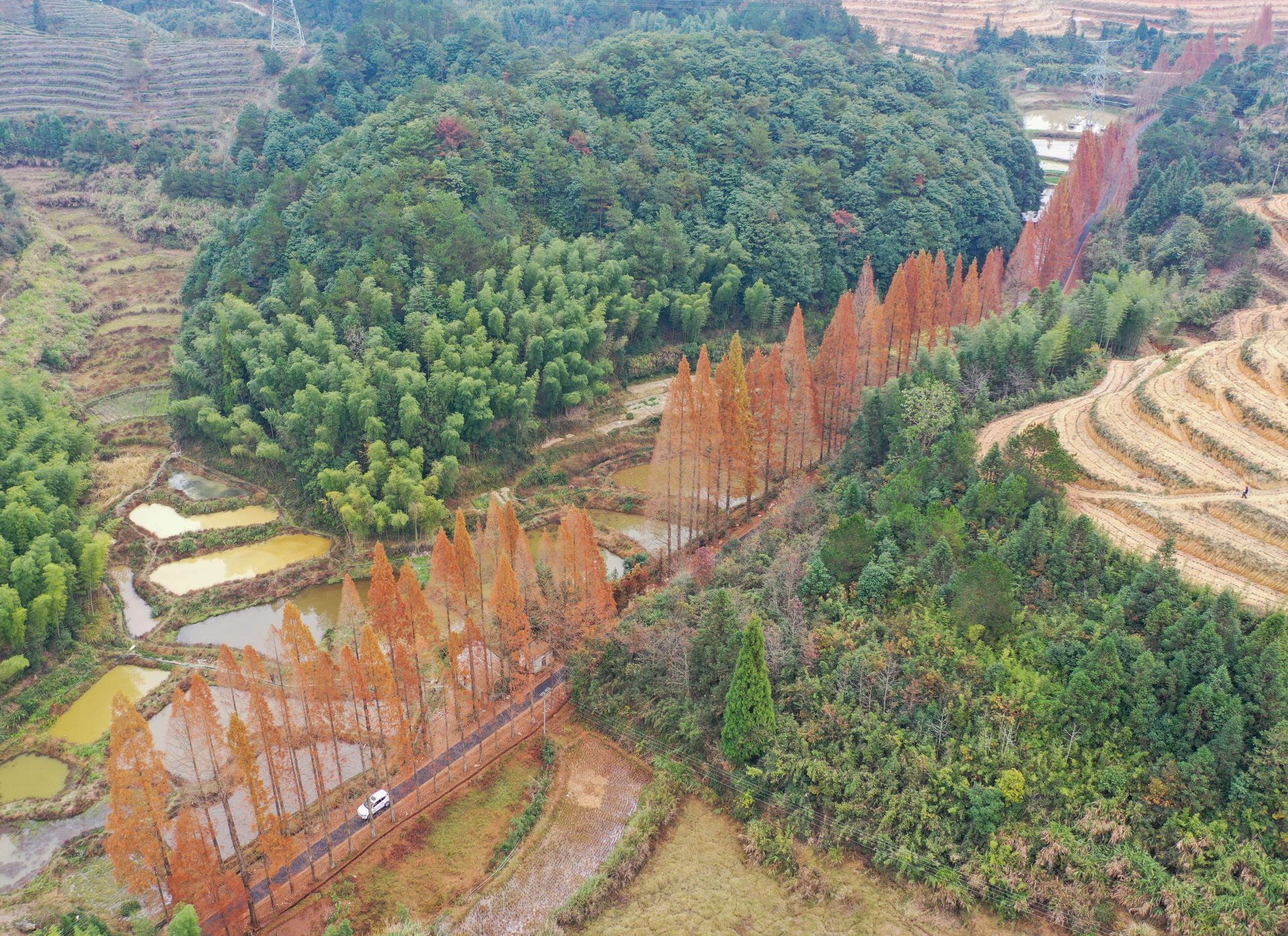 12月7日,汽车行驶在景宁县鹤溪街道余山村水杉掩映的道路上(无人机照片)。新华社发(李肃人 摄)