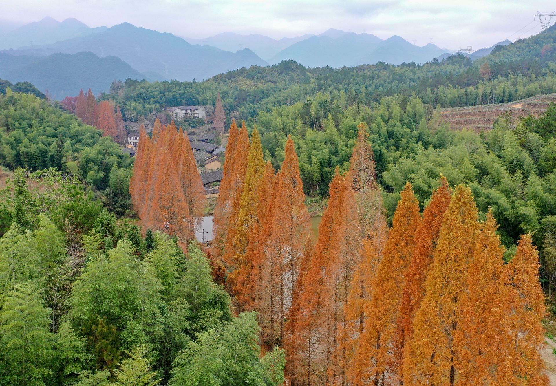 这是12月7日在在景宁县鹤溪街道余山村拍摄的水杉(无人机照片)。新华社发(李肃人 摄)