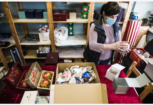 12月8日,在俄罗斯莫斯科州若斯托沃村,工作人员将用于装饰新年枞树的彩球装入盒内。若斯托沃彩画工艺的历史可以追溯到19世纪初期,当时,莫斯科郊区的一些城镇和村庄出现了生产涂漆制品的作坊,产品包括托盘、烟盒、茶壶等。若斯托沃彩画的图案主要有花卉水果,生活图景,神话故事及文学作品的情节等,画工精细,生动逼真。绘制着若斯托沃彩画的工艺品除了具有实用价值,还常常作为俄罗斯家庭的新年装饰品,同时也是热门的礼品和旅游纪念品。 新华社 发(马克西姆 摄)