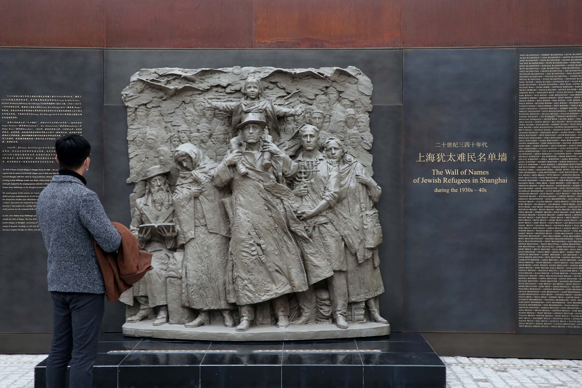 12月8日,观众在上海犹太难民纪念馆广场参观上海犹太难民名单墙。 2020年是世界反法西斯战争胜利75周年。为进一步保存、铭记第二次世界大战上海拯救犹太难民的历史记忆,上海犹太难民纪念馆加速扩建。扩建工程于12月8日宣告完成,纪念馆重新对外开放。 2007年上海市虹口区以二战时期“摩西会堂”旧址为基础,设立上海犹太难民纪念馆。此次经过扩建,上海犹太难民纪念馆整体面积增至4000多平方米,展览分为逃亡上海、避难生活、同舟共济、战后离别、特殊情谊、共享未来六部分,陈列展品增加到近1000件,其中有相当一部分为首次亮相的文物,包含二战上海犹太难民及后人的捐赠品。 新华社记者 任珑 摄