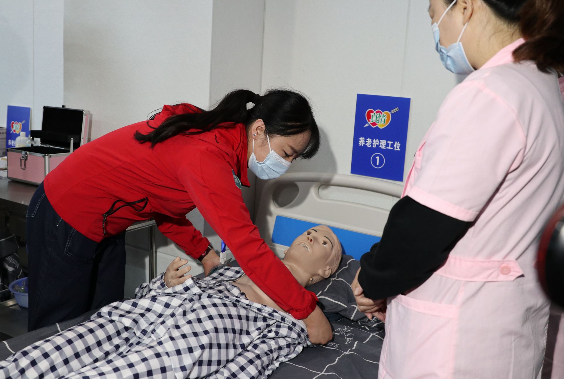 12月14日,参赛选手(左)展示护理工作。新华社记者 黄国保 摄