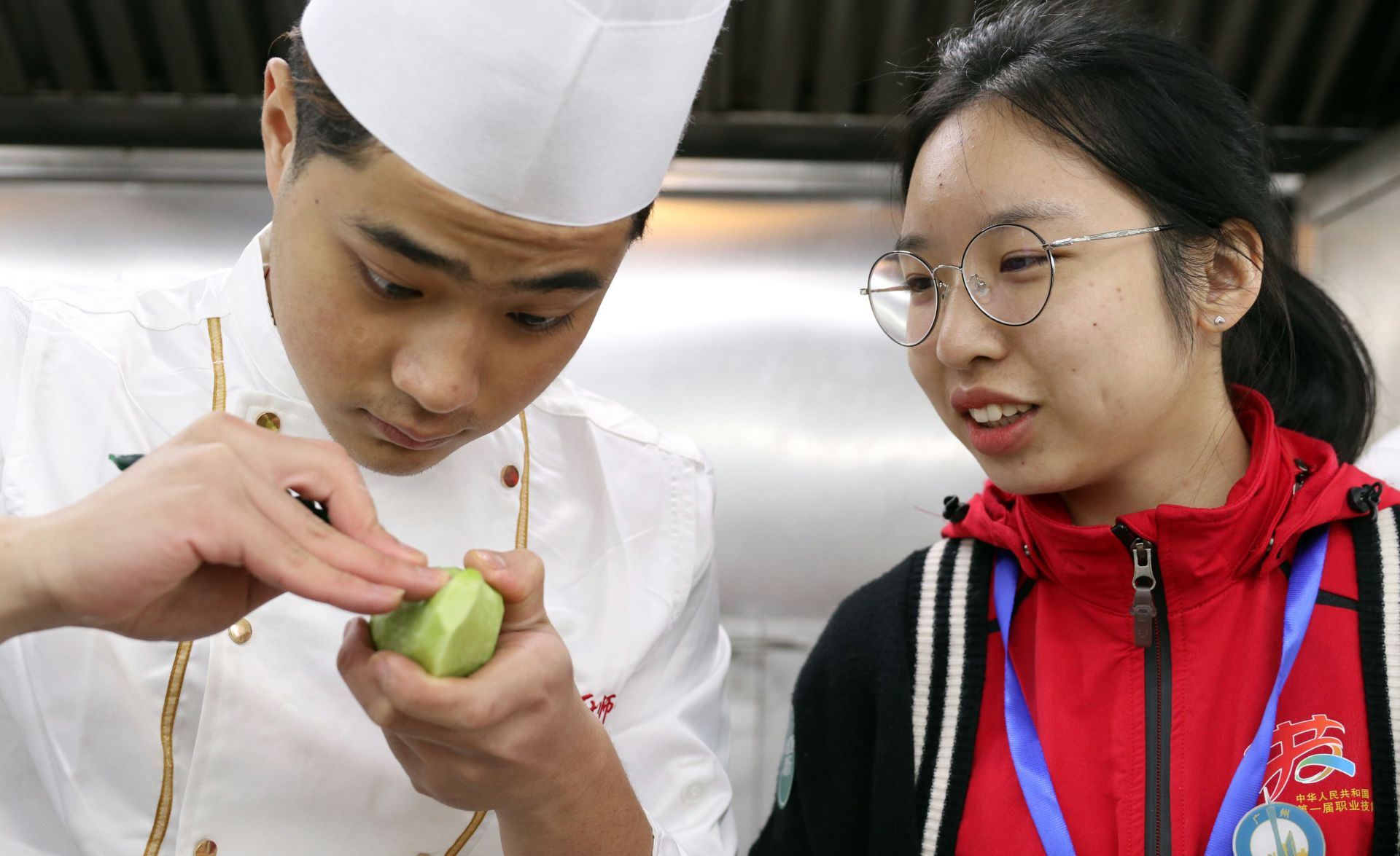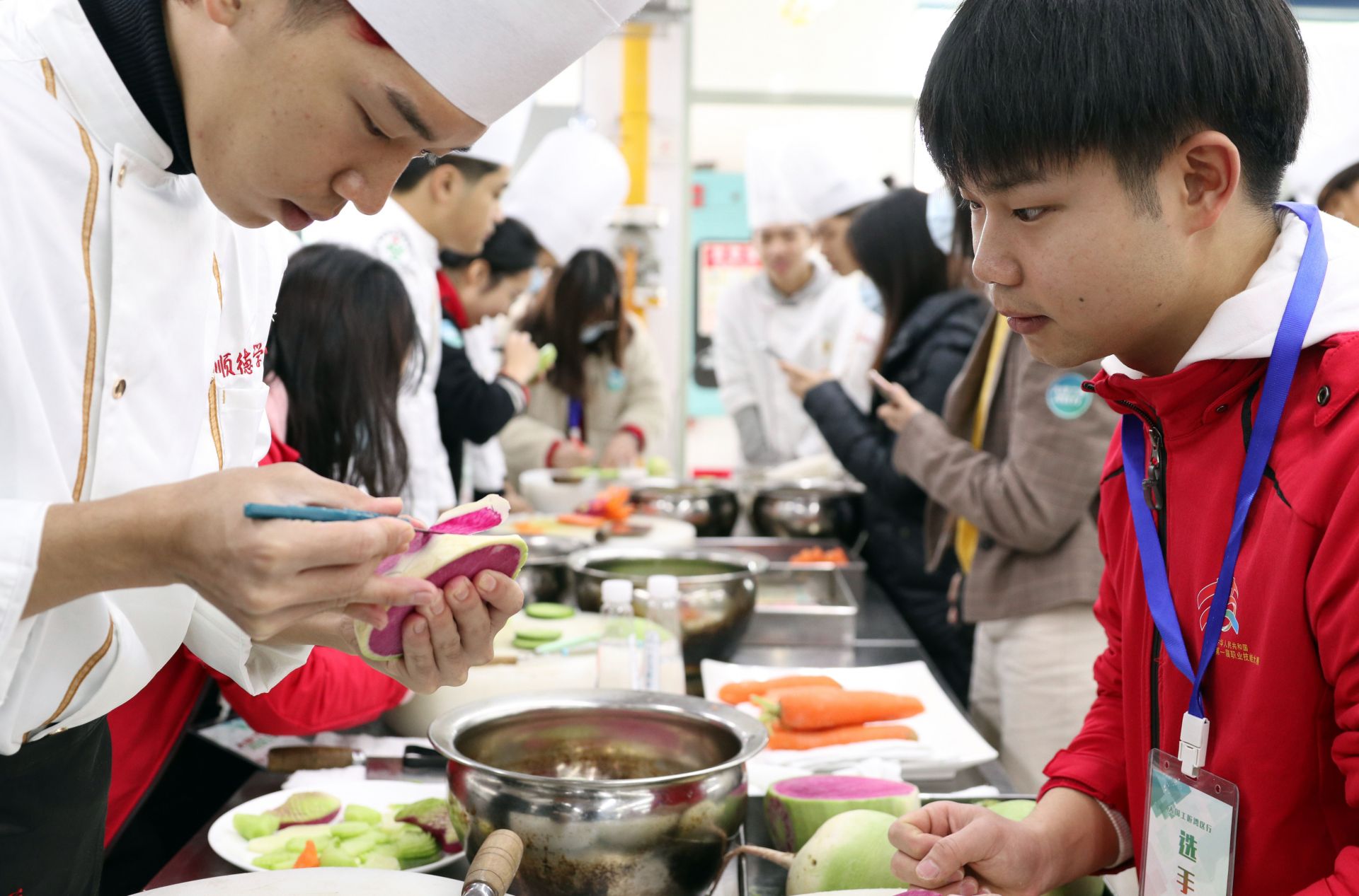 12月15日,顺德厨师学院学生(左)向参赛选手展示雕花制作。新华社记者 黄国保 摄