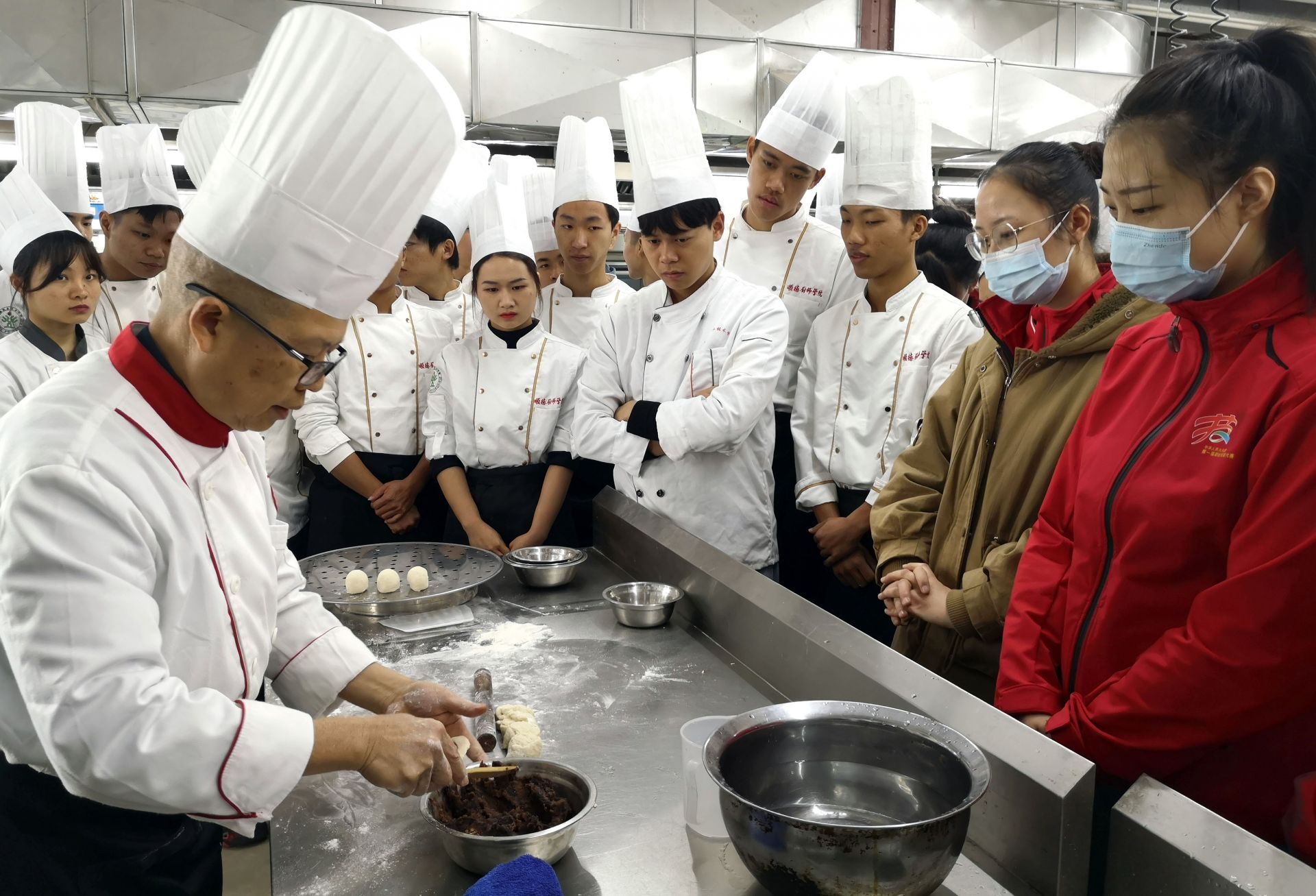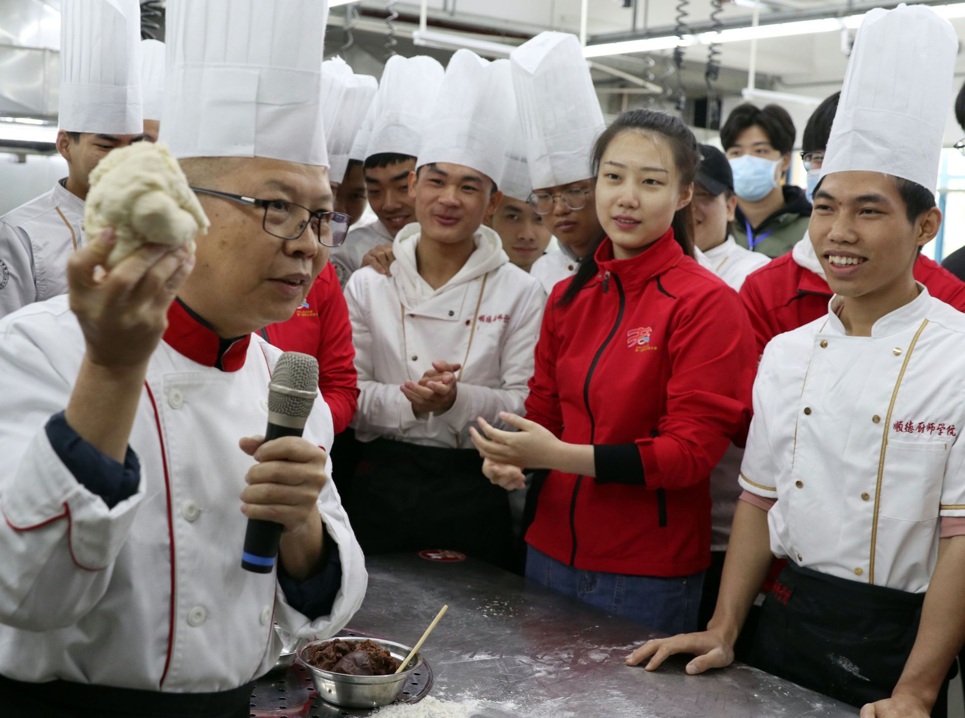 12月15日,顺德厨师学院老师向参赛选手展示制作点心。 12月14日至16日,“大国工匠湾区行”活动在广州启动。36名在中华人民共和国第一届职业技能大赛中获得优异成绩的选手参加本次活动。活动分为“大国工匠走进超级工程”、“高端制造与高水平技能人才”、“技能,点亮湾区生活”三大路线。通过走访粤港澳大湾区内地主要城市的重点企业、重大项目、重要机构生产科研一线,来深入感受粤港澳大湾区高质量发展的成果。 新华社记者 黄国保 摄