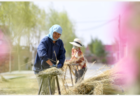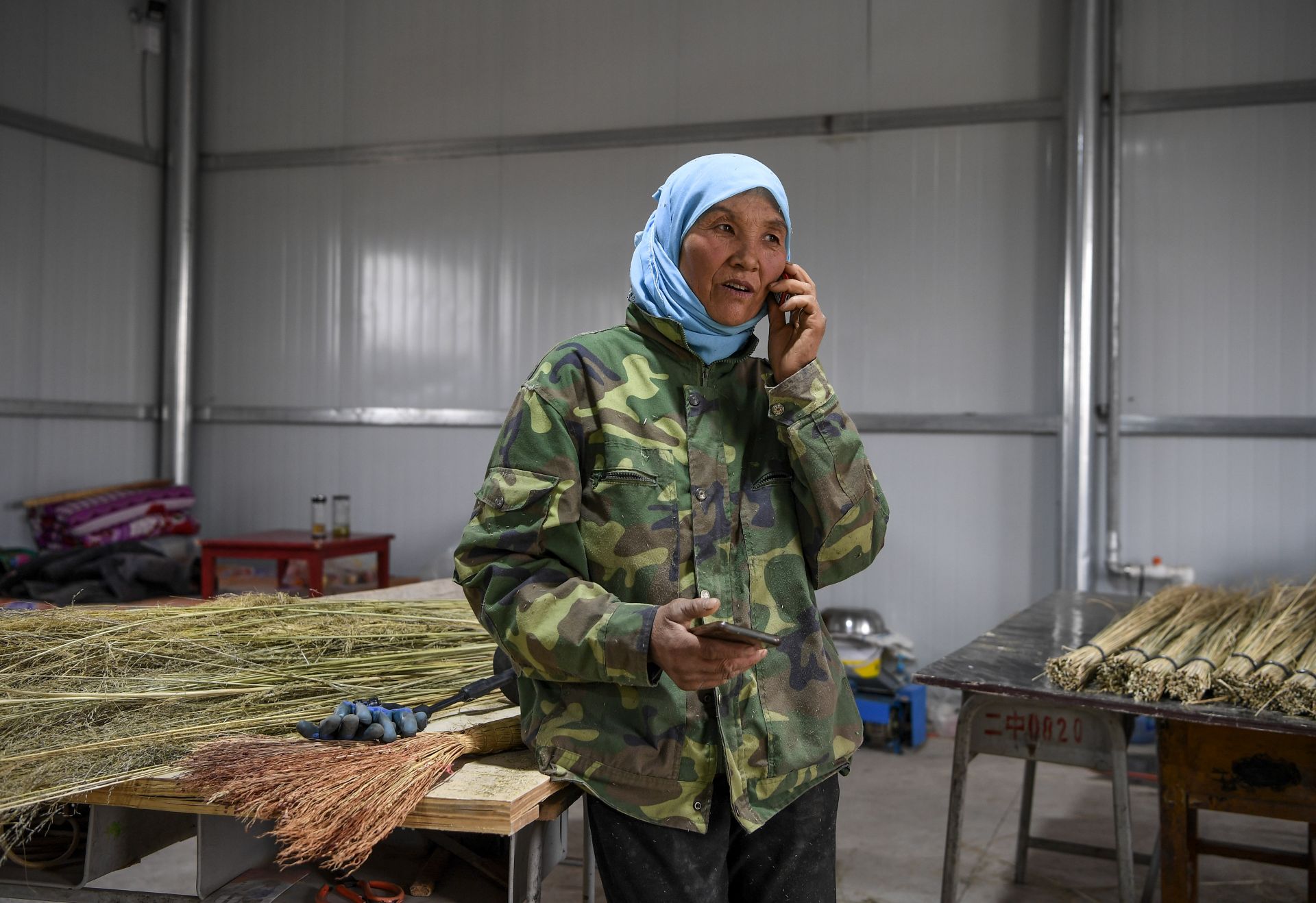李耀梅(左)和工人在加工制作扫帚的芨芨草(6月10日摄)。