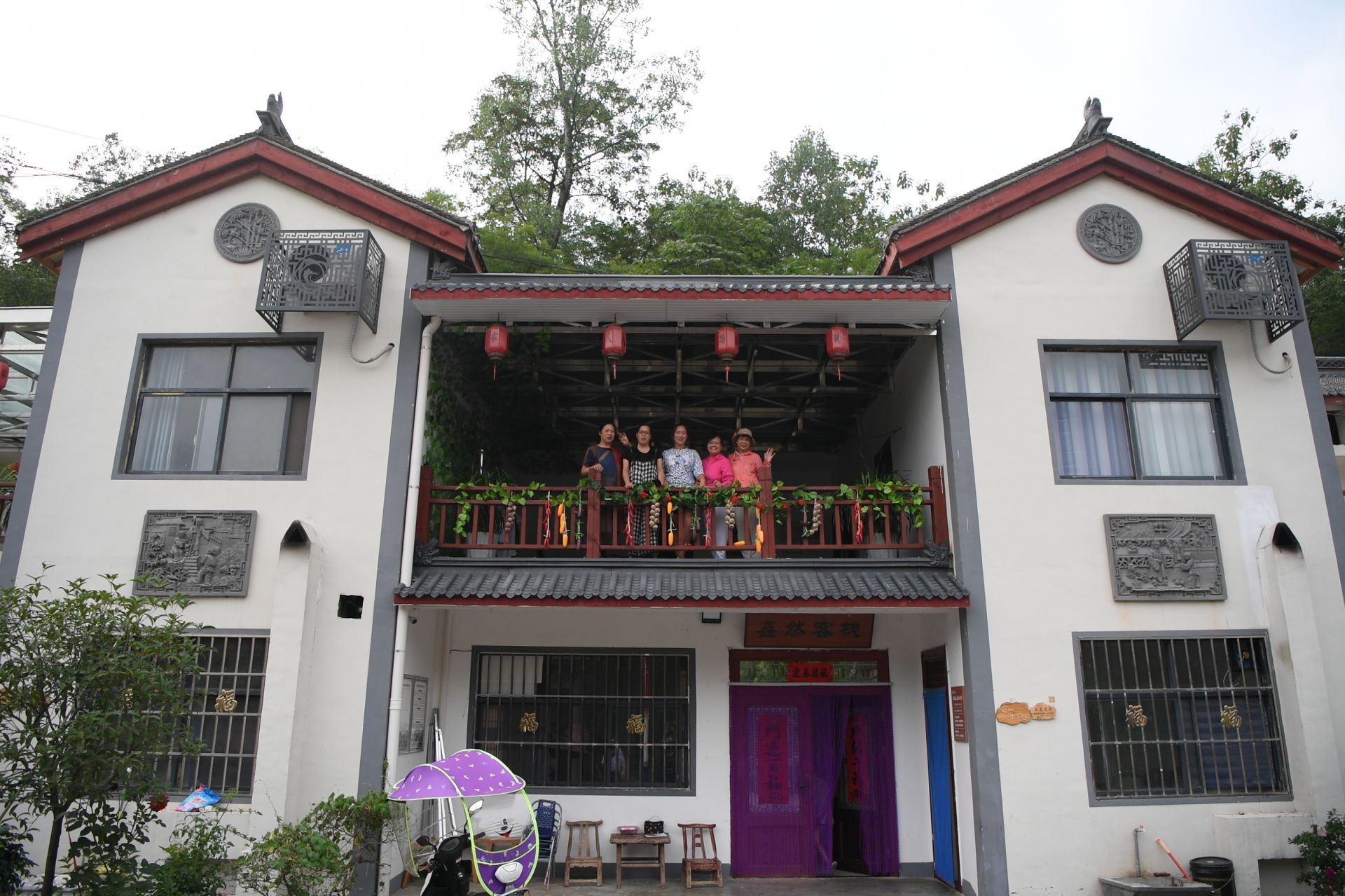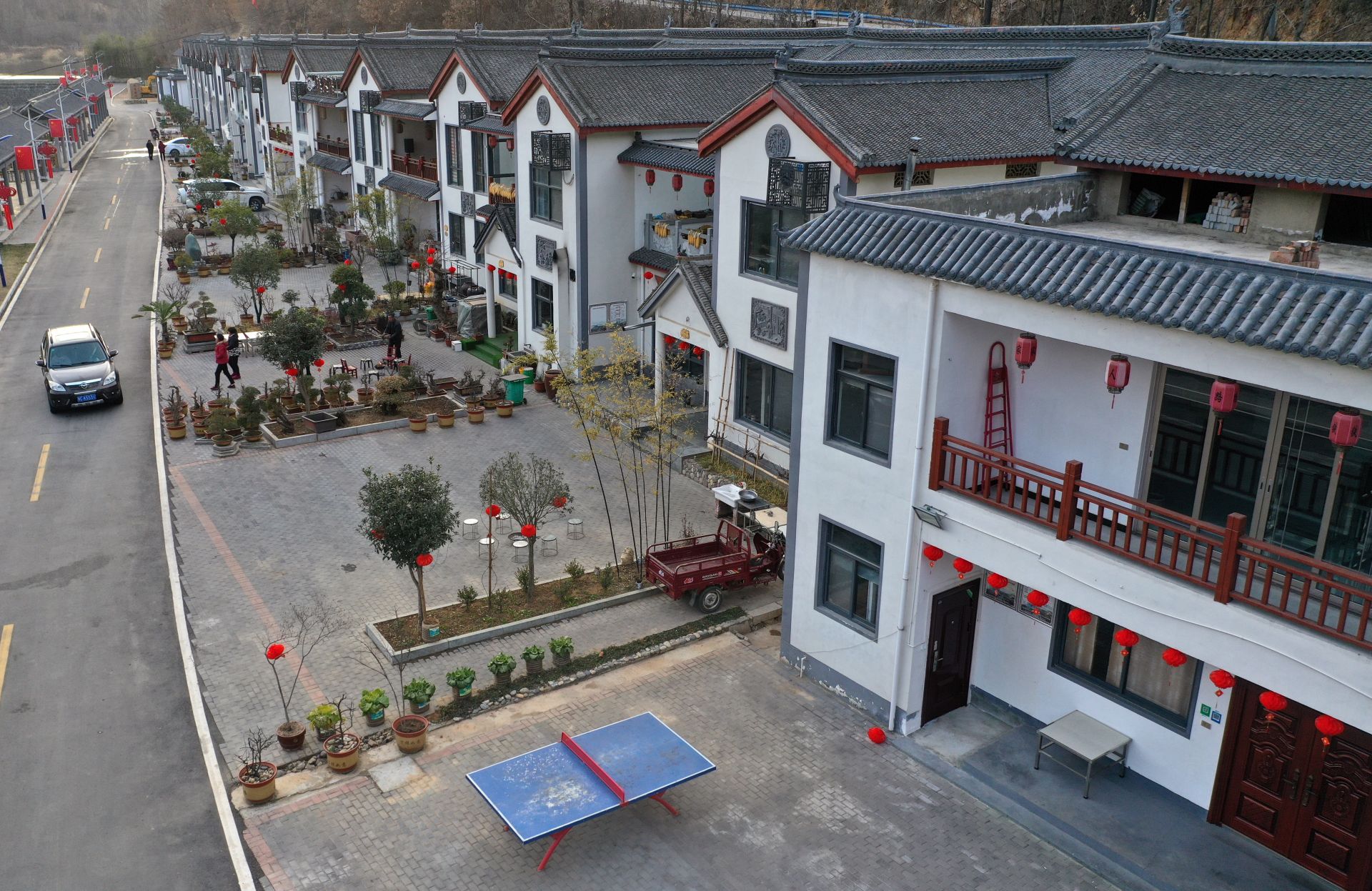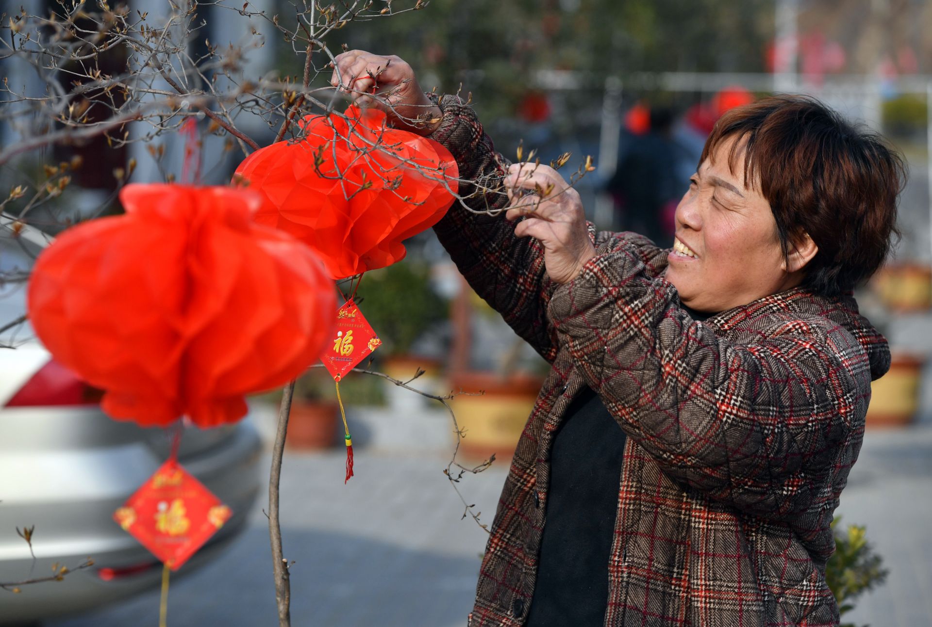 新南村村民在自家民宿前挂上灯笼,准备庆祝元旦(12月29日摄)。河南省栾川县新南村地处伏牛山深处。近年来,当地积极发展特色乡村旅游,融入火车、铁轨等铁路元素,打造“铁路小镇”旅游品牌,吸引越来越多的游客前来游玩,新南村群众也走上了乡村文旅产业的致富路。新华社记者 李嘉南 摄