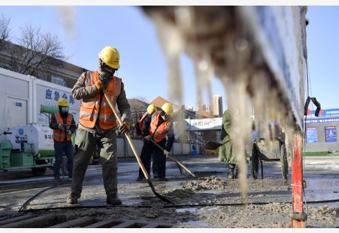 1月6日,中国交建的建筑工人在天津地铁11号线建设工地清理路面积冰。当日,受强冷空气影响,天津市出现大风降温天气。根据天津市气象局预报,此次冷空气影响具有风力大、气温低、持续时间长等特点,最低气温或将突破近30年同期极端最低气温。寒潮来袭,在城市的各个角落,不少人依然坚守户外岗位,一个个“敢冻”的身影,保障着城市正常运行。新华社记者 李然 摄